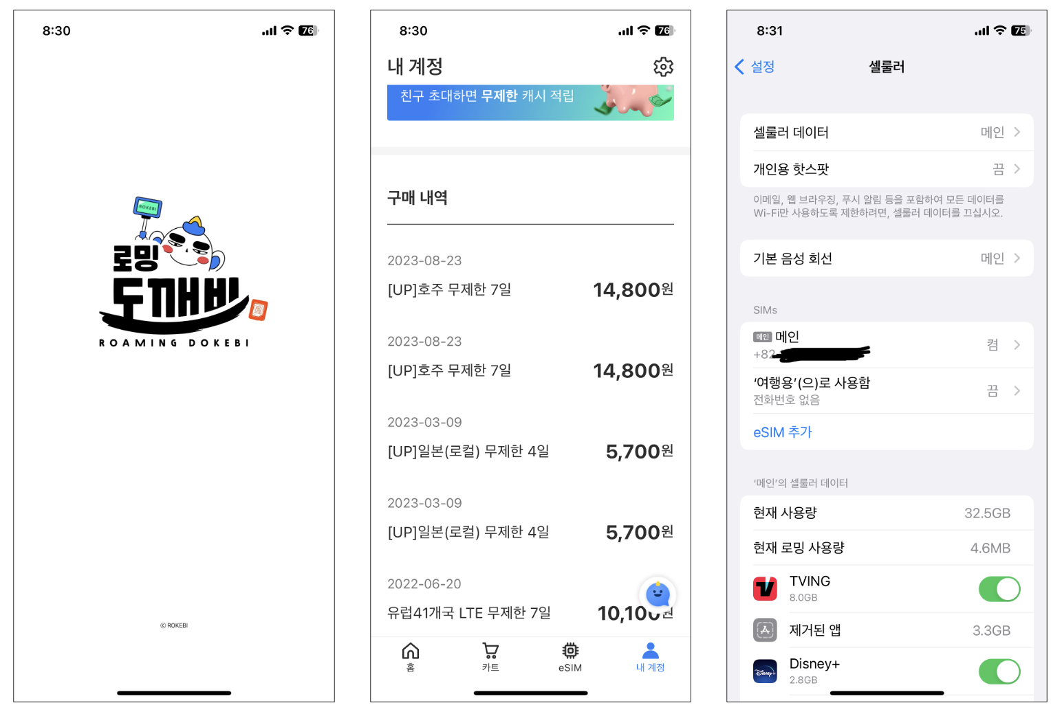 스페인 여행 이후로 일본, 오스트레일리아까지 전부 eSIM을 썼는데 200% 만족합니다. 제가 처음 경험한 eSIM이 로밍도깨비라는 곳에서 구입했었기에 계속 이 서비스만 이용 중인데 아마 다른 곳도 있는 것 같긴 해요. 저는 너무 만족하고 있어서 계속 쓰게 될 것 같긴해요. eSIM 설정이 처음엔 낯설어서 어색했는데 어렵지 않아서 누구나 쉽게 설정할 수 있어요. 아마 eSIM 지원하지 않는 휴대폰도 있어서 확인은 해보셔야 해요.